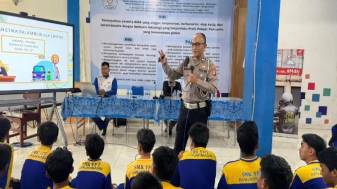Satlantas Polresta Banjarmasin, jajaran Polda Kalimantan Selatan (Kalsel), kembali melaksanakan edukasi pelajar melalui kegiatan Police Goes to School dan Polantas Menyapa di lingkungan Sekolah Menengah Kejuruan Swasta Yayasan Pelita Edu Teknika (SMKS YPT) Banjarmasin, Jalan Rawasari Ujung, pada Jumat pagi.